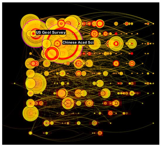 Although these countries had the highest numbers of citations in 1979–2021, the two most cited affiliations were the Chinese Academy of Sciences, China and the US Geological Survey (USGS), USA (Figure 5). The countries with the highest numbers of citations were the USA in 1981, France in 2006 and Canada in 1991 (Figure 6). The USGS is a water, earth, biological science and civilian-mapping agency that collects, monitors, analyzes and provides a scientific understanding of natural resource conditions, issues and problems in the region. The US Geological Survey published 475 articles on topics related to climate change, according to the records in the WOSCC database. Meanwhile, as mentioned above, the Chinese Academy of Sciences has many branches in many cities but was pooled under one heading in this study, so the analysis results could be different if the different branches were analyzed separately.
