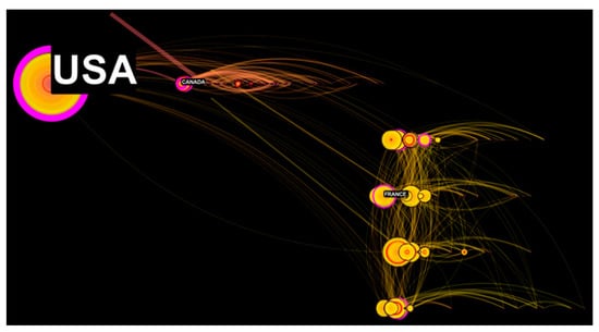 The top 10 countries that were involved in studies on the impacts of climate change on heavy metal contamination in coastal areas were the USA, the People’s of Republic China, France, Australia, Germany, England, Spain, Canada, Italy and India (Figure 2d). From 1979 until recently, the USA was the top country in the world for publishing studies on the theme of climate change and heavy metals, with a total of 1832 publications, followed by the People’s of Republic China, with 961 publications. Meanwhile France, Australia and Germany published about 609–641 articles. England and Spain contributed 594 and 526 publications, respectively, while Canada, Italy and India contributed over 416–494 publications. Although most of the top authors and institutions were not from the USA, the USA remained the top contributor in selected study areas. The main publications on climate change issues related with heavy metals according to the top two countries were mercury and lead studies (the USA and the People’s Republic of China [], sea level rise (the USA []) and cadmium studies (the People’s Republic of China []).