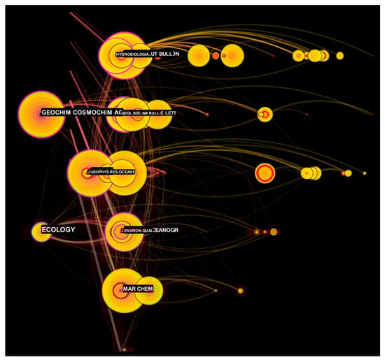 The top 10 most cited journals are shown in Figure 7. Ecology, Geochimica et Cosmochimica Acta and Science of the Total Environment were the top three most cited journals in studies related to climate change and heavy metals in coastal areas, with centrality scores of 0.18, 0.16 and 0.15, respectively. Ecology is a journal that reports research on all aspects of ecology, while Geochimica et Cosmochimica Acta publishes research on the subjects of terrestrial geochemistry, meteoritics and planetary geochemistry. Science of the Total Environment publishes research on the environment as a total, including the atmosphere, lithosphere, hydrosphere, biosphere and anthroposphere. The articles by Audry et al. [], Adelson et al. [] and Wedepohl [] (which were the three most cited articles) were all published in Geochimica et Cosmochimica Acta, which is why it was one of the most cited journals.