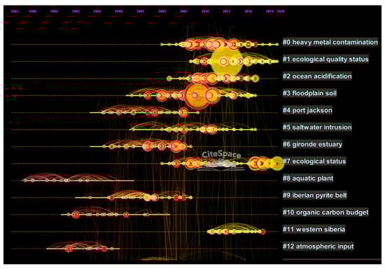 Among the most cited journals, there were 33 co-citation clusters, from which we identified the 13 largest clusters (Figure 8). Out of those 13 clusters, the most important cluster was heavy metal contamination (Figure 8), followed by the ecological quality status, ocean acidification, floodplain soil, Port Jackson, saltwater intrusion, the Gironde estuary, ecological status, aquatic plants, the Iberian pyrite belt, organic carbon budgets, eastern Siberia and atmospheric inputs (Figure 8). Although heavy metal contamination was the most cited topic, the majority of the studies in this cluster were published around 2007–2017. Ecological status was the eighth most cited topic, the majority of the citations occurred around 2017–2020, indicating that this was a recent research topic. Moreover, ecological quality status was also a popular topic around 2004–2020, although this cluster reached its peak number of citations around 2013–2016. These top clusters, i.e., heavy metal contamination, ecological quality status, ocean acidification, etc., were also the main topics studied by the top authors and the main topics of the most cited articles, as mentioned previously. There were few studies (almost none) on aquatic plants, the Iberian pyrite belt, organic carbon budgets and atmospheric inputs after 2008.