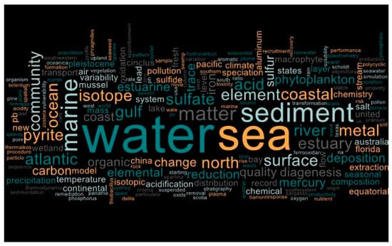 Figure 9 shows the distributions of the major keywords in studies related to the impacts of climate change on heavy metal contamination in coastal areas from 1979 to 2022. Though our analysis was only from 1979 to 2021, some articles were published in 2022 and their results are also shown. The major keywords included water, sea, marine, sediment, metal, element, coastal, community, ocean, pyrite, isotope, surface, north, sulfur, carbon and ocean. The characteristics of the top 10 keywords from 1979–2022 are shown in Table 1. They were climate change, surface change, surface sediment, lead, copper, management, cadmium, diversity, coastal, ecosystem and ocean acidification. Among these keywords, climate change, surface sediment and management were the three most frequently used keywords over recent years (2014–2022) in studies related to the impacts of climate change on heavy metals in coastal areas. The most frequently used keywords in studies on this topic in 2015–2020 were diversity, coastal, ecosystem and ocean acidification, while the most frequently used keywords in 1993–2010 were lead, copper and cadmium.