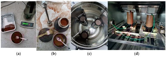 On the basis of the preset test scheme, a series of specimens was used as illustrated in Figure 1a,b. The test results were based on the average of three test specimens with preset porosity and saturation to reduce test error. A triaxial saturator and a vacuum water dispenser were used, as displayed in Figure 1c, to ensure that the specimen reached a saturation of 100%. A cabinet with constant temperature and humidity was applied to regulate the temperature of the specimen, and the saturation was held constant, as illustrated in Figure 1d.