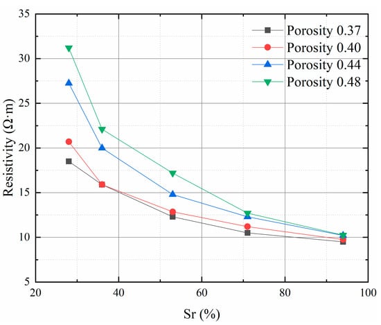 Figure 3 shows that resistivity increased with the increase in porosity, whereas the other conditions did not vary greatly. However, when saturation was high, the effect of the increase in porosity on resistivity was relatively small because the electrical conductivity of the soil was mainly determined by pore water. For the same soil–rock composite media, resistivity decreased considerably with the increase in saturation. Therefore, in this study, porosity and saturation were combined into one index, namely volumetric water content.