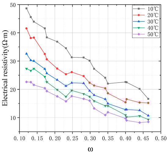 When the other conditions remained unchanged, resistivity exhibited a regular nonlinear change with volumetric water content. Resistivity changed from 50 Ω∙m to 15 Ω∙m when the volumetric water content was varied from 0.12 to 0.47 at 10 °C. At 50 °C, resistivity changed from 23 Ω∙m to 8 Ω∙m when the volumetric water content was changed from 0.12 to 0.47. That is, the lower the temperature, the greater the change in resistivity with the change in volumetric water content. When the volumetric water content was 0.12, resistivity changed from 50 Ω∙m to 22 Ω∙m with the change in the temperature from 10 °C to 50 °C. When the volumetric water content was 0.47, resistivity changed from 17 Ω∙m to 8 Ω∙m when the temperature was changed from 10 °C to 50 °C. That is, the lower the volumetric water content, the greater the change in resistivity with the change in temperature. Figure 4 shows that, although the resistivity of the specimen had a turning point or even an opposite trend at different water content intervals, the overall trend and resistivity were strongly negatively correlated. Therefore, a reliable model of the relationship between conductivity, volumetric water content and temperature can be established.