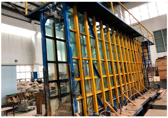 Figure 6 shows that the landslide model was built on a special test platform, which was 8 m long, 2 m wide and 3.5 m high. A water supply pipe and a drainage pipe, which could control the water level at the front of the slope, were located at the left end of the test platform. A series of nozzles were installed on top of the test platform to simulate different rainfall intensities.