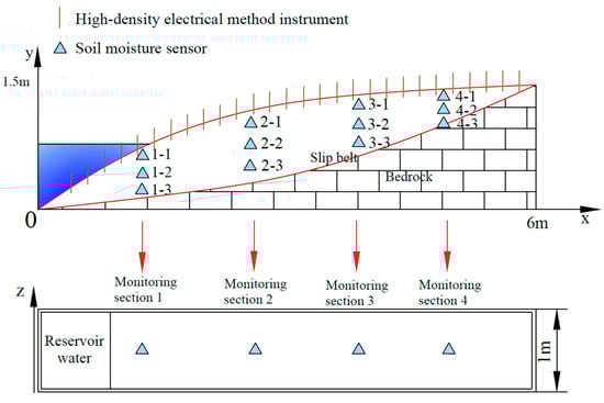 A large-scale landslide model test was conducted to verify the reliability of the obtained resistivity model. The landslide model was applied to investigate the migration characteristics of slope water under two hydraulic conditions: changes in water level in front of the slope and rainfall. Water content, pore water pressure and resistivity, which can reflect the soil state, were measured during the test.