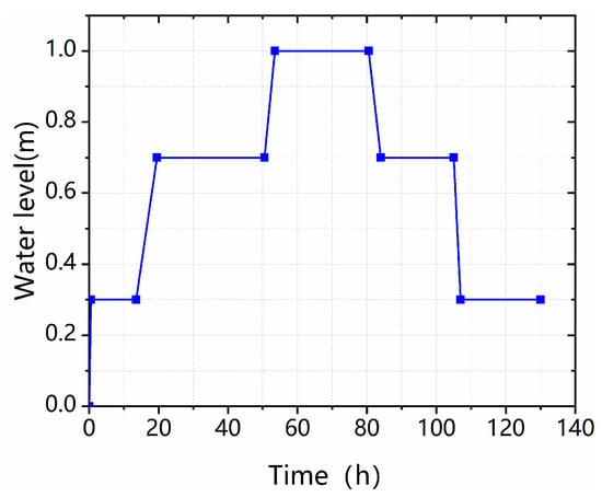 Reservoir water levels are an important hydrodynamic condition of reservoir slopes. They can result in displacements and affect slope stability. In this experiment, four water levels were used. The specifications of water levels and durations are displayed in Figure 9. The influence of rainfall was also studied in the experiment. The rainfall duration was 24 h, and the rainfall intensity was set to 0.29 and 0.25 . These two important hydraulic conditions were simulated in the landslide model, and their responses were tested and analyzed in detail.