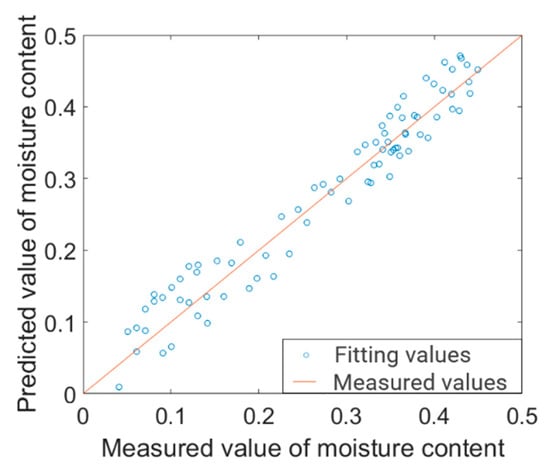 As shown in Figure 10, a slight difference was found between the values of volumetric water content obtained from the equations fitted in this study and the actual monitored volumetric water content. Moreover, the predicted values were distributed around the actual monitored values, and the root mean square error of the model was only 0.0211. Therefore, the inversion of the resistivity model is suitable and has a certain reliability.