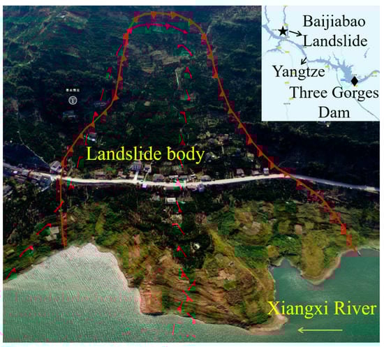 The Baijiabao landslide is located in Group 2 of Xiangjiadian Village, Zigui County, in the Three Gorges Reservoir area on the right bank of the Xiangxi River, which is a tributary of the north bank of the Yangtze River. It is 2.5 km away from the Xiangxi Estuary and 41.2 km away from the Three Gorges Dam site. Its geographical coordinates are 30°58′59.9″ N, 110°45′33.4″ E. The slope body wherein the landslide is located has a gentle platform slope and gully ridge, and its terrain varies greatly. The strata in this area are dominated by Jurassic sand and mudstone. Given that the study area is located in the western Hubei fold mountain, the terrain gradient changes considerably. The valley area, low hill area and middle alpine denudation mesa terrain slope are slow and are typical erosion structure types. The landslide had no obvious surface macrodeformation characteristics before the Three Gorges Reservoir was impounded in 2003, but began to show signs of deformation after the impoundment. A realistic view of the Baijiabao landslide feature is shown in Figure 11.