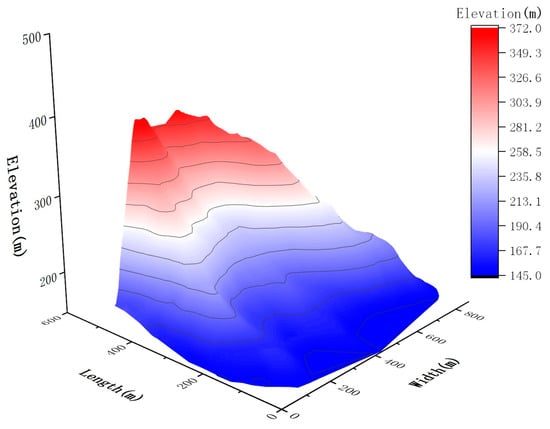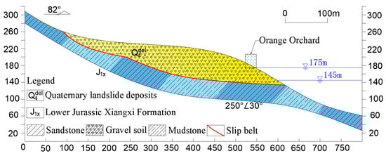 The Baijiabao landslide is a typical landslide soil accumulation. Its back edge is bound by a steep and slow intersection on the landform. The Baijiabao landslide has a trend of approximately 40°, and its back edge has an elevation of approximately 270 m. The left and right sides of the landslide are bound by a protruding ridge with exposed bedrock on both sides. The right side of the ridge reaches 85°. The leading edge runs straight to the Xiangxi River, with an elevation of approximately 125 m. The landslide is narrow from top to bottom, with an average width of approximately 400 m. Its leading edge is approximately 500 m wide, its trailing edge is approximately 300 m wide and its longitudinal length is approximately 550 m. The landslide accumulation body has an average thickness of 35 m. The landslide body has a surface volume of 24 × 104 m2 and a volume of 840 × 104 m3 as shown in Figure 12. Geomorphologically, the front part of the landslide is convex and falls into the Xiangxi River with an average slope of approximately 20°; the middle part is relatively gentle and is approximately 10°–15° and the rear part is steep. The landslide is a typical reverse slope with a concave profile. The material composition of the landslide is mainly landslide deposits comprising grey–yellow and brown–yellow silty clay and irregularly alternating intercalated gravel and fragmentary stone soil. The silty clay is loose to slightly dense, hard plastic to plastic and slightly wet, and the block stone is mainly composed of strong to moderately weathered sandstone and mudstone with a fragment content of 5–50% and a particle size of 0.2–60 cm. The gravel soil is slightly dense to dense. The stone content can reach 30–50%, and the fine soil contains silty clay, clay and breccia.