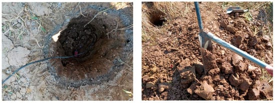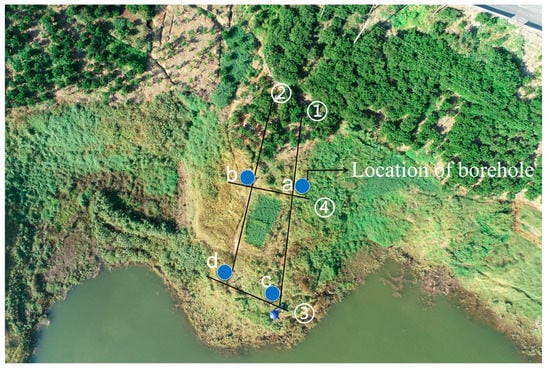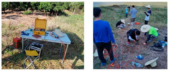 Borehole sampling with a Luoyang shovel was performed at the intersection of the transverse and longitudinal survey lines (Figure 16) to test the reliability of the predicted results. Each sampling hole was divided into layers with an interval of 0.5 m. Three soil samples were taken with a ring knife, and each hole was divided into six layers with a depth of 3 m. Each soil sample was treated on the same day and weighed to determine its mass and volume. A microwave oven was used to dry the soil sample. Then, the soil sample was weighed to determine its quality and calculate its water content.
