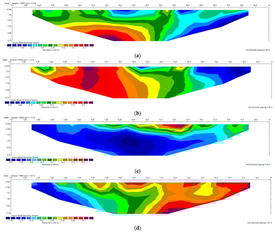 Resistivity distribution of different measuring lines: (a) survey line 1; (b) survey line 2; (c) survey line 3; (d) survey line 4.