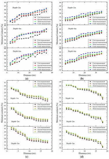 Distribution of the moisture contents of different measuring lines: (a) survey line 1; (b) survey line 2; (c) survey line 3; (d) survey line 4.