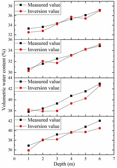 Data on the resistivity, temperature and volumetric water content of the landslide body were obtained from indoor model experiments on the landslide. Then, the predicted volumetric water content of the landslide body was inverted by using the previously specified resistivity equation in combination with the experimentally obtained resistivity and temperature data. Monitoring data taken over 60 h of the rising phase of the reservoir water levels were selected for calculation and analysis to verify the correctness of the above resistivity model. The resistivity and temperature values at the exact locations of the sensors were selected for inverse analysis to correspond to the actual monitoring data on water content on a case-by-case basis.