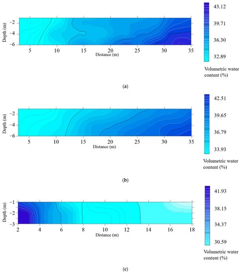 The geophysical method is a non-invasive method for site investigation that provides new technical ideas for obtaining the cross-sectional data on soil water content. The high-density electrical method is one of the most important geophysical exploration methods [], and is based on the electrical method [,,,]. The high-density resistivity method is an array-based exploration method in which the spatial and temporal distribution of resistivity is obtained by laying electrodes in the measured medium and measuring soil resistance []. The presence of moisture reduces the resistivity value of different water-bearing media. The high-density electrical method is feasible and advantageous because it can quickly collect geoelectric data over a large area and facilitate a comprehensive understanding of moisture distribution in water-bearing media [].