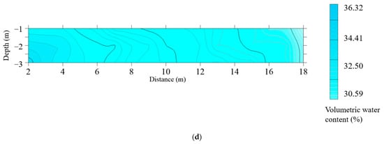 Results of water content inversion: (a) survey line 1; (b) survey line 2; (c) survey line 3; (d) survey line 4.