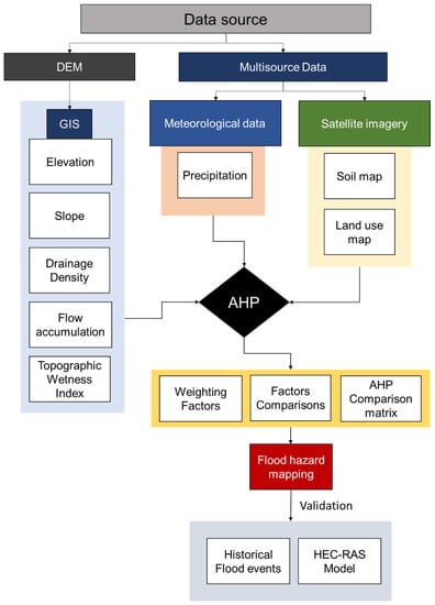 The location of flood catastrophes may be accurately predicted via flood risk mapping, which can assist in lessening their consequences [30]. The location of the flood is influenced by many factors that must be precisely mapped and identified. Therefore, by merging multiple databases, geographic information system (GIS) techniques can be utilized to perform spatial analysis [31]. One of the methods for evaluating multiple alternatives is the Analytical Hierarchy Process (AHP) [32,33]. AHP is a powerful decision-making approach that can be used in developing flood risk maps to compare the performance of the various criteria [34,35,36,37]. Using elevation, climate, land use data, soil data, and the GIS environment, the efficiency of flood analysis can be enhanced [38].