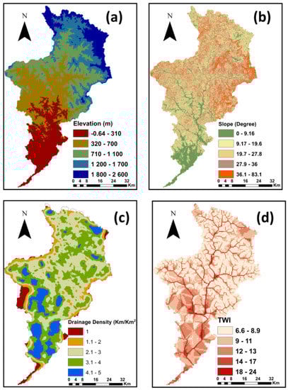 Flood hazard factors: (a) elevation; (b) slope; (c) drainage density; (d) topographic wetness index (TWI).
