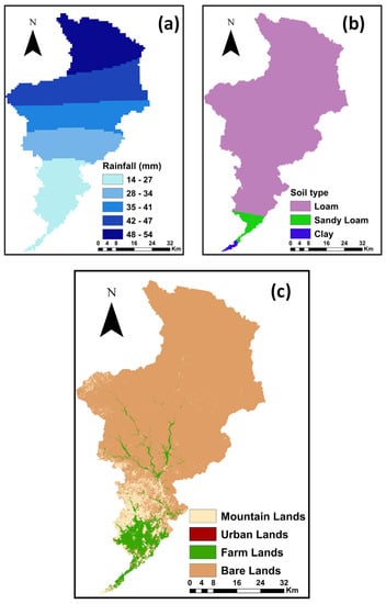Soil parameters in a basin, such as the soil layer thickness, permeability, infiltration rate, and the quantity of wetness in the soil before the rainfall event, directly influence the rainfall–runoff process [50,55]. The structure and infiltration capability of soils will considerably impact their ability to infiltrate water. Because of the capacities of different soil types, a decreased soil infiltration capacity leads to greater surface runoff, which increases the danger of floods [50,55]. When the water supply rates exceed the soil’s ability for infiltration, water moves down the slope as runoff over sloping terrain, resulting in floods [56]. Three classes of soil in the study area were extracted from satellite images, namely loam, sandy loam, and clay, as shown in Figure 6b.