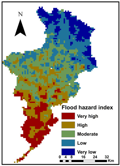 The pairwise contrast matrix and factor map are used to determine the weight and ranking of each factor. The weight value of the priority factor is presented as a percentage number between 0% and 100%. Table 4 includes a list of the targeted factors, their weights, and their rankings. Rankings ranged from 1 to 5, with 5 being the most influential factor and one being the least influential. The flooding hazard map for the study watershed was created using the data from Table 4, as shown in Figure 7. According to the watershed’s flooding hazard, there was a very high, high, moderate, low, and very low flooding hazard area, which was 12.71%, 23.15%, 26.85%, 24.23%, and 13.06% of the watershed area, respectively.