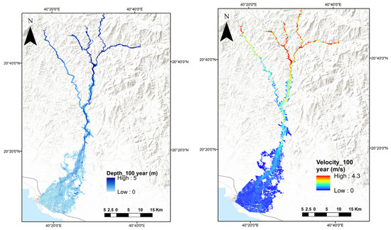 Water runoff depth and velocity from a 2D HEC-RAS model with a 100-year return period.