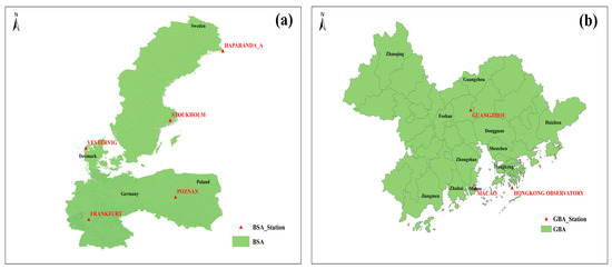 ECA&D (European Climate Assessment & Dataset) contains a series of daily observations at meteorological stations throughout Europe and the Mediterranean. In the BSA, we selected five stations (Stockholm, Haparanda_A, Vestervig, Poznan, and Frankfurt) from four countries (Sweden, Denmark, Poland, and Germany) as representative stations with the longest observed data and with few missing data. Three stations are located in the coastline area and two stations in the inland area (Figure 2a, Table 1). The daily datasets of precipitation and temperature used in this study were downloaded from https://www.ecad.eu/dailydata/index.php (accessedon 31 January 2020). For the daily series, we chose to use blended date, which means the gaps in daily series of stations were infilled with observations from nearby stations within 12.5 km distance and with a height difference of less than 25 m. For continuous missing data of some sites, especially for more than 8 days in a month, we established a regression equation between representative sites and several alternative stations to replace missing values, for which a Euclidean distance method was used to calculate the nearest stations as alternative stations. To make sure the replaced data were reliable, the sites with correlation coefficients of the recent five years of nearby missing data passing a 95% significance test were selected as alternative sites. The correlation coefficients (R2) of the regression equation were all above 0.68, which means the regression data can replace missing data well. Using daily data, which delete the scattered missing data after regression supplement, we calculated monthly mean temperature, monthly total precipitation, annual mean temperature, and annual total precipitation (Table 2). In the GBA, Guangzhou (in the inland area), Hong Kong, and Macao stations (in the coastline area) were chosen as representative stations (Figure 2b, Table 1). The monthly data of Guangzhou and Hong Kong came from Guangdong Climate Center and https://www.weather.gov.hk/tc/cis/climat.htm (accessed on 20 November 2022). The daily datasets of Macao were downloaded from https://frame.smg.gov.mo/centenary/index.htm (accessed on 20 November 2022). Using the same method for missing data in the BSA, we obtained monthly and annual data in the GBA (Table 3).