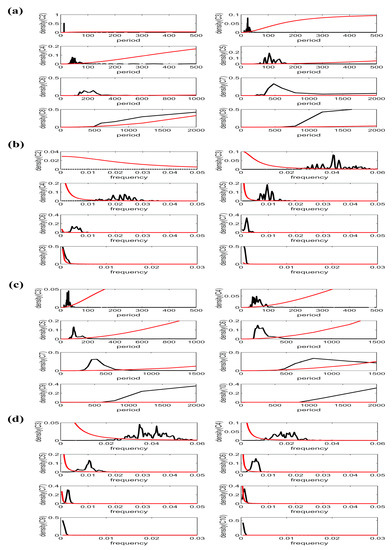 Power spectrum analysis of IMFs at Hong Kong in GBA (period-density (a), frequency-density (b)) and Stockholm in BSA (period-density (c), frequency-density (d)).