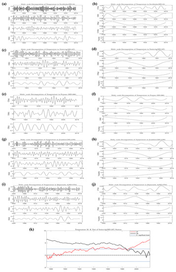 IMFs and trends of mean monthly temperature in Stockholm station (a,b), Vestervig station (c,d), Poznan station (e,f), Frankfurt station (g,h), and Haparanda_A station (i,j); temperature M-K test of Vestervig station (k).