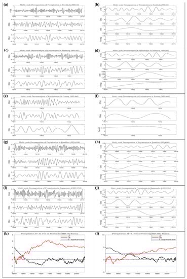 IMFs and trends of mean monthly precipitation in Stockholm station (a,b), Vestervig station (c,d), Poznan station (e,f), Frankfurt station (g,h), and Haparanda_A station (i,j); precipitation M-K test of Stockholm station (k) and Vestervig station (l).