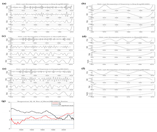 IMFs and trend of mean monthly temperature in Hong Kong (a,b), Macao (c,d), and Guangzhou station (e,f) and temperature M-K test of Macao station (g).