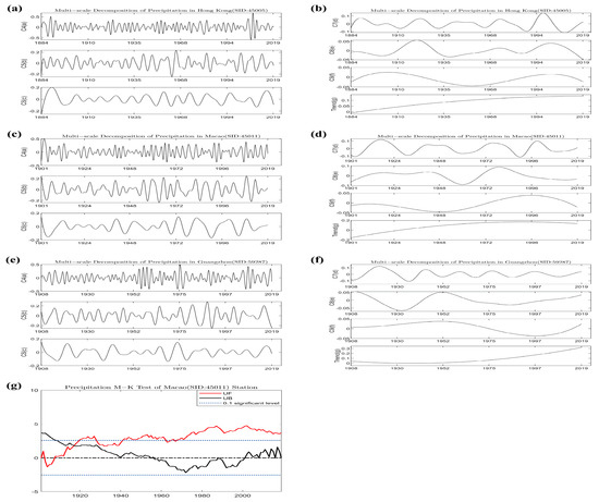 IMFs and trend of monthly total precipitation in Hong Kong (a,b), Macao (c,d), and Guangzhou station (e,f) and precipitation M-K test of Macao station (g).