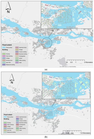23] performed a comparative flood damage model assessment research that compared and contrasted seven different damage models developed for various regions in Europe and the United States: Damage Scanner (The Netherlands), the Rhine Atlas (Rhine Basin), the Flemish Model (Belgium), Multi-Coloured Manual (MCM) (UK), HAZUS-MH (USA), and the JRC (Germany, European Commission/HKV) are some of the models used. Five of the seven models are based on aggregated land-use data rather than individual objects (HAZUS-HM and MCM), demonstrating that the scale of work is an important feature when selecting or developing a damage model. In addition, it is worth noting that only two out of the seven models are based on individual objects, demonstrating the difficulty of creating such detailed damage models. While object-based models can account for variations in building density in areas with the same land-use type, area-based models can be used to quickly calculate over wider areas. However, HAZUS-MH and MCM, which are object-based models, use a large number of object types and corresponding flood damage features. FLEMO, HAZUS-MH, and the Rhine Atlas models are empirically developed, and they have low transferability to other study areas or regions, as significant errors are often verified when these are to infer damage in areas other than those for which they were developed [