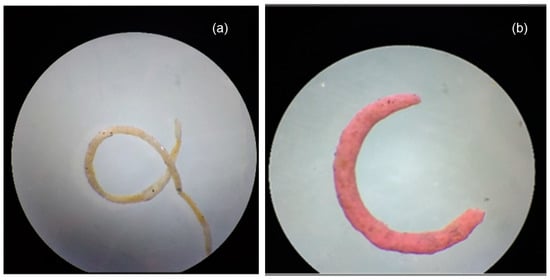 After 24 h of feeding on a natural diet (fish food), the excrement collected from the control appeared small and twisted (Figure 1a), and those collected from the treatment appeared rope-like and C shaped (Figure 1b). The undigested, stained component of the snail’s excrement collected from treatment indicated the presence of plastic particles in the faeces (Figure 1b).