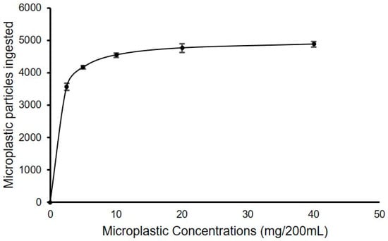 MP particle ingestion rate by P. acuta at six concentrations of MP (each data point represents mean and standard errors of 10 replicates).