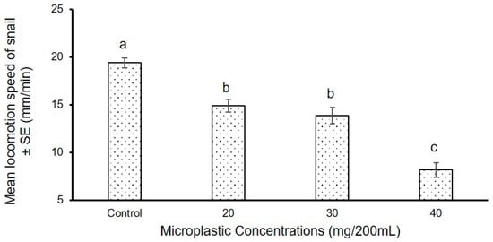 Weighted average of 93 days’ locomotion speed of P. acuta in control (without MPs) and in the medium applied with three concentrations of MPs (20, 30 and 40 mg/200 mL) (n = 93). Data points with differences superscribed with different alphabets are statistically significant (p < 0.05).
