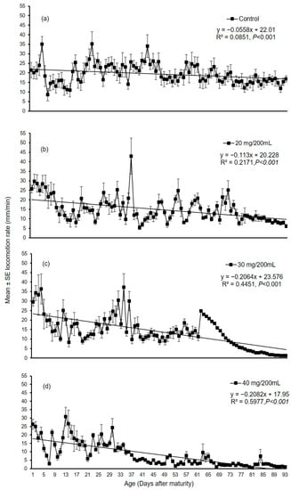 In the control group, the locomotion speed was slower after day 74, whereas in the treatment group (40 mg/200 mL MPs concentration), the reduced locomotory speed was observed very early after day 32, followed by 30 mg/200 mL MPs concentration after 63 days and 20 mg/200 mL after 72 days (Figure 5a–d).