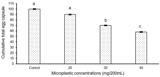 Cumulative total (Mean ±SE) of egg capsule production/individual by P. acuta for 93 days of experimental duration in control, and in the medium with three concentrations (20, 30 and 40 mg/200 mL) (n = 10) of polystyrene microplastics. Data points with differences superscribed with different letters are statistically significant (p < 0.05).