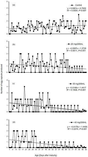 The effect of age for average experimental duration on the control was not significant. The effect of age on daily egg capsule production was significant (p < 0.001) in the treatment cohorts (Figure 7a–d). Number of egg capsule produced daily was uniform during 93 days of experimental duration (Figure 7a), whereas in the treatments, no egg capsule production occurred after 78, 84 and 88 days, respectively, at high, medium and low concentrations (Figure 7b–d). Among the three different concentrations, the highest concentration (40 mg/200 mL) used in the experiment had a highly significant effect on egg capsule production (Figure 6). Although there was a ~10% reduction in total egg capsule production at low MP level, the differences between the control and lower concentration were not significant (Figure 6).