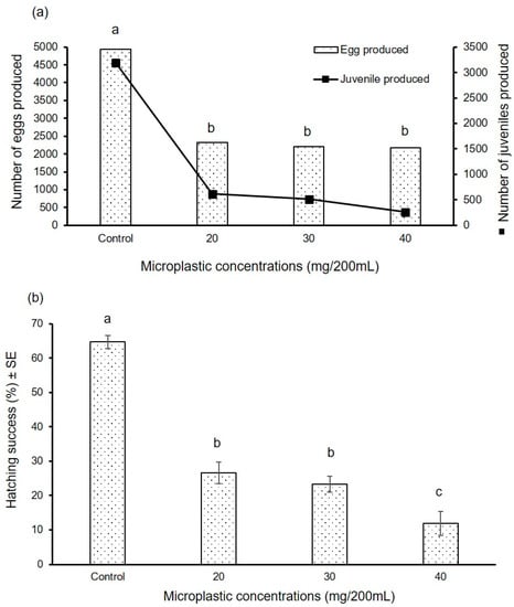 Reproductive output of P. acuta (n = 10) in terms of (a) total number of eggs produced and juveniles hatched for 93 days after maturity and (b) egg hatching success (±SE) in control and in the medium applied with three concentrations (20, 30 and 40 mg/200 mL) of microplastics. Data points with differences superscribed with different letters are statistically significant (p < 0.05).