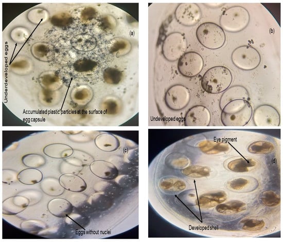 Egg hatching success was significantly (p < 0.001; one-way ANOVA, Welch test) affected by the presence of MPs in the environment (Figure 8b). The number of hatched juveniles in the control were maximum (3191), followed by 20 mg/200 mL MPs concentration (618), 30 mg/200 mL MPs concentration (511) and 40 mg/200 mL MPs concentration (260). In this study, we observed accumulated MPs on the surfaces of egg capsules and delayed hatching of eggs in the treatments with all three MP concentrations. Underdeveloped eggs were visible over a three-week period, and eggs without nuclei appeared from exposure to three MPs without any further development post three weeks, in comparison to the control (Figure 9a–c).