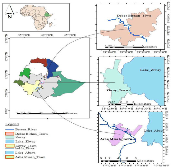 This study was conducted in three urban towns of Ethiopia, each located at different altitudes: Arba Minch (1300 m), Ziway (1600 m), and Debre Birhan (2800 m). Arba Minch is a city found 500 km south of the capital city Addis Ababa, located at geographical coordinates of 6°2′0″ N 37°33′0″ E. Even though the city is categorized as one of the hotter climate areas, it is surrounded by two big natural lakes (Abaya and Chamo) and is considered one of the areas with a good groundwater potential zone in the country. The town has an average annual temperature of 29 °C and average annual rainfall of 900 mm. Ziway is located 163 km southeast of Addis Ababa. The town has a latitude and longitude of 7°56′ N 38°43′ E, an annual rainfall of 700–800 mm, and a mean annual temperature of 20 °C. Debre Birhan is one of the coldest towns in Ethiopia, located 120 km northeast of Addis Ababa. The town has a latitude and longitude of 9°41′ N 39°31′ E, a mean annual temperature of 15 °C, and a mean annual rainfall of 1219.2 mm. The topographical locations of the three towns in Ethiopia are displayed in Figure 1 below.