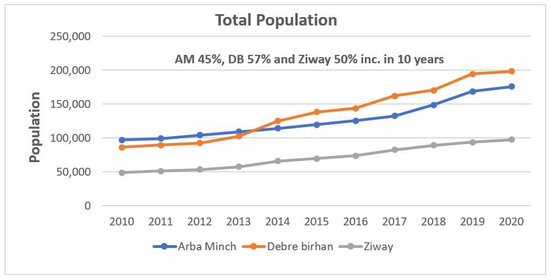 The population of all three study areas has grown over the past 10 years due to the migration of people from rural to urban areas. The town of Ziway is relatively small, while Arba Minch and Debre Birhan have relatively higher populations. The data shows that Ziway and Debre Birhan areas have had a population increase of more than 50% in the last 10 consecutive years. As the population grows, so does the demand for water supply, which represents an additional burden on municipal waterworks; as the urban population grows, so will the number of users. Figure 2 below shows the population trend over the last 10 years in the towns of Arba Minch, Debre Birhan and Ziway. The percentage increase in population is 45%, 57%, and 50% for Arba Minch, Debre Birhan, and Ziway, respectively.