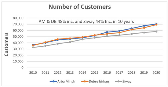 Increasing population density has put high pressure on existing water sources in Arba Minch, Debre Birhan, and Ziway. In the past 10 years, the average number of customers connected to the town water supply service was 48% for Arba Minch and Debre Birhan and 44% for Ziway. The residents of the towns can access water at least twice a week. They fetch water from a tap and store it in their house when there is no water supply. The quality of water can be adversely affected by this method of storing it. Data shows that the current water production amount from the town water utility is less than what the population demands: households are only getting 2 to 3 h of water supply in a day with little reliability in each urban area studied. The lack of infrastructure and current management practices are more to blame for the towns’ problems than the lack of water. That the distribution system is quite old and needs to be replaced by a bigger pipe to compensate for the demand of consumers is one of the problems raised by the Arba Minch and Debre Birhan water authorities. The infrastructure of the water supply system was not updated as the number of customers increased. Water demand management can be used to improve the current system. The number of users connected to the town water supply service is shown in Figure 3.