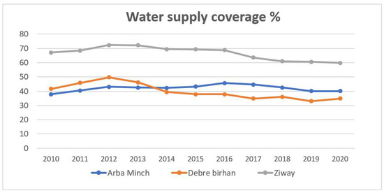 The percentage coverage of water supply is one of the best indicators to describe the standard of water supply service. However, there has been no significant improvement in the expansion of water supply coverage within the last 10 years (the water supply coverage of the three urban areas for the last 10 years can be seen in Figure 4). This illustrates around 40% coverage for Arba Minch and Debre Birhan and an average of 65% coverage within 10 years for Ziway town. This figure depends on population increase as well as the number of customers registered at the town’s water supply authority and using the town’s water supply connection. Because the number of customers is increasing every year alongside the rise in population, the percentage coverage does not show that much change within a year. This result reveals that Arba Minch and Debre Birhan are vastly growing in population, and the demand for water is consequently increasing, while Ziway is not expanding or increasing its needs at the same rates as the other two urban areas. Despite the differences in growth, in all three study areas, consumers receive water on average 3 days per week, and only for a specified time, mostly in the morning and evening. Customers must fetch and store water for the times that there is no access and boil this water for drinking.