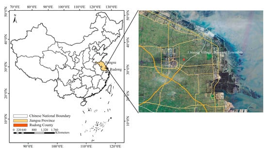 The location of the studied coastal reclamation area in Liuzong Village, Juegang town, Rudong Country, Jiangsu Province, China.