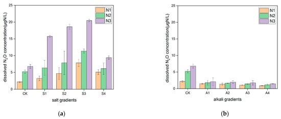 Dissolved N2O concentration in the water treated with different salinity and alkalinity: (a) dissolved N2O concentration in the water treated with different salinity (n = 45); (b) dissolved N2O concentration in the water treated with different alkalinity (n = 45).