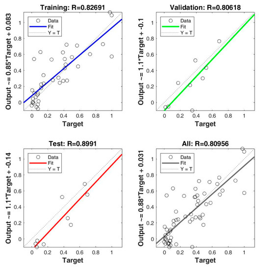 Based on the identification of the key factors leading to changes in dissolved N2O concentration, the BP neural network model was constructed with the key factors and dissolved N2O concentration to achieve the high-precision prediction of dissolved N2O concentration in the overlying water. The key influencing factors that grey correlation degrees were higher than 0.8 with dissolved N2O concentration were selected as the neurons in the input layer, including the system saline-alkali index (EC and pH of the overlying water and sediment), DO of the overlying water, and microbial genes nirS, nirK, and nosZ. The output layer is the dissolved N2O concentration in the overlying water. In the training progress, the method of random division was adopted to divide the data into the training set, validation set, and test set so as to ensure that the predicted value is more reliable. The training set was used to determine the parameters of the BP neural network. The validation set was used to verify the accuracy of the model trained each time so that the number of iterations and learning rate were constantly adjusted to make the results on the validation set optimal. After the final training of the model was completed, the accuracy of the final model was tested with the test set. The default number of hidden layer nodes in the BP neural network model was 10. The network target error was 1 × 10−10. The learning speed was 0.05. The number of training steps was 50,000. The BP neural network was trained according to the above settings until it met the intended target, as shown in Figure 3. R was the accuracy of the model; Target was the true value of the sample; Output was the actual output value of the model. The tested neural network converged faster and the output error was reduced to the minimum at 10 steps. The goodness of fit for the training set was 82.69%, for the validation set it was 80.62%, and for the test set it was 89.91%, which explained that the model has a good goodness of fit. The BP neural network model test the trained network with test samples by simulation Sim function. The test results were well in line with the predetermined settings. The Figure 3 showed that the overall accuracy of the model (R) was 0.810. The network training results showed that this artificial neural network can be used to predict the dissolved N2O concentration in saline-alkali shallow-water ecosystems, and the model has a wide range of applications.