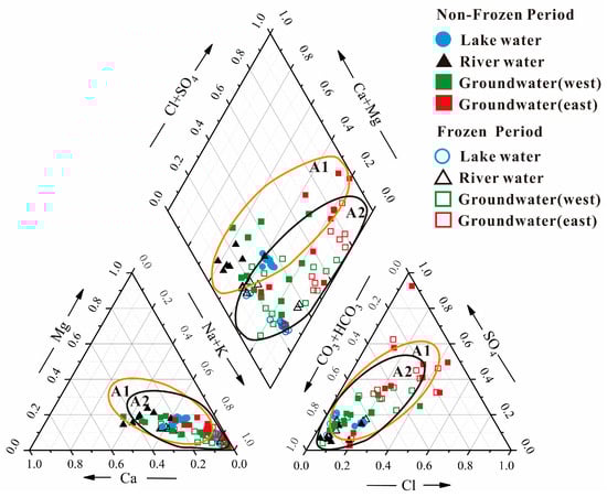 In Figure 2, A1 and A2 are the primary distribution zones of each body of water during the non-frozen and frozen periods, respectively. The distribution of the sample sites on the Piper diagram is separated into these two regions. The weakened dynamics of the water column beneath the ice cover, which resulted in less water-rock interaction, caused a significant difference in the ion concentrations at the sampling locations: the cation composition did not differ significantly from one period to the next, but the anions were closer to the HCO3− + CO32− endmember during the frozen period. The groundwater on the western shore of the lake was closely distributed with the lake and river water in the different seasons, and the water chemistry types were similar. This phenomenon suggests that the interactions between the three were somewhat similar. This is primarily due to the strong evaporation in the summer and the influence of wind direction and sediment input from rivers, resulting in lower concentrations of HCO3− and higher concentrations of Cl− during the non-frozen period. The higher Na+ + K+ concentrations in the frozen season were related to longer circulation time, and lower renewable rate.