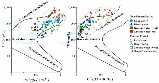 Gibbs diagram of the main water chemical ions in different seasons in each water body in the study area. B1: non-frozen period; B2: frozen period.
