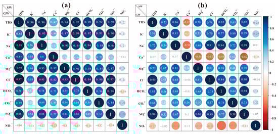 Correlation of the major ions between lake water and groundwater during the different seasons: (a) non-frozen season; (b) frozen season.